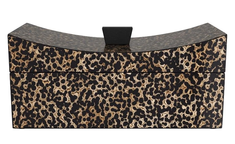 Description: The peregrine tray features a bold, black wood frame lined with a black-and-white tribal inkblot print crafted in resin. The versatile accent piece injects a dose of striking pattern in a minimalist interior, or provides an additional graphic layer in a more maximalist environment. Finish will vary.